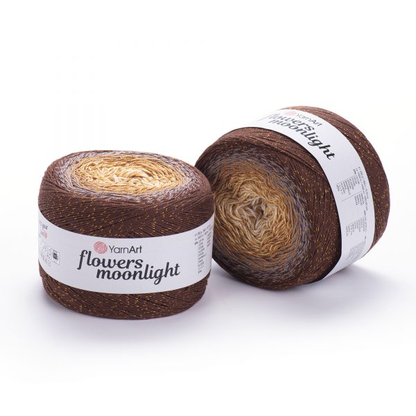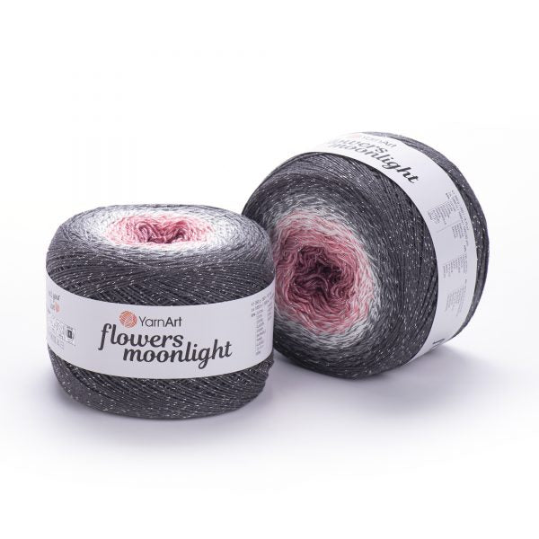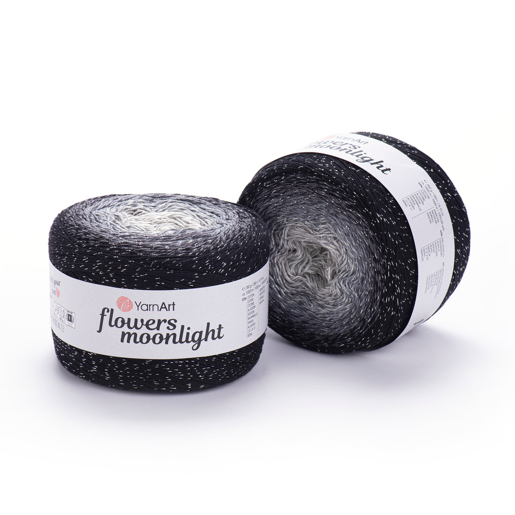 YarnArt Flowers Moonlight adds a sprinkle of magic to the legendary Flowers collection. This generous cake yarn features the same beloved soft cotton blend and seamless color transitions, but with an added metallic thread (Lurex). The result is a fabric that glimmers subtly like moonlight on water, making it the ultimate choice for evening shawls, elegant stoles, and summer tops that need a bit of glamour.