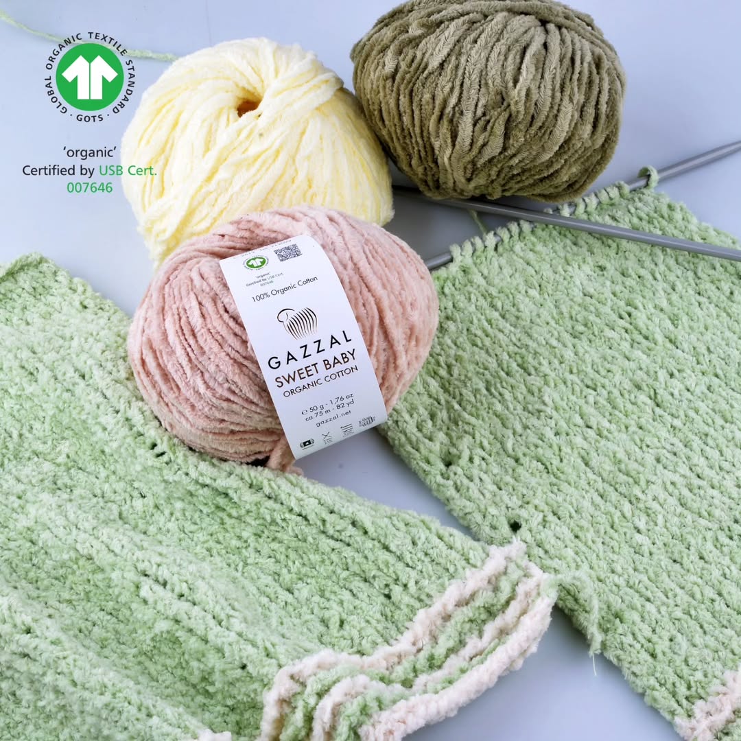 Gazzal Sweet Baby is a celebration of natural softness and eco-conscious crafting. This premium yarn is made from 100% organic cotton and carries the prestigious GOTS (Global Organic Textile Standard) certification, ensuring it is grown and processed without harmful chemicals or pesticides. With a thicker, plush structure compared to traditional cotton yarns, it creates a substantial yet breathable fabric that is exceptionally gentle on the most sensitive skin.