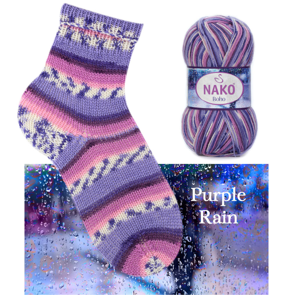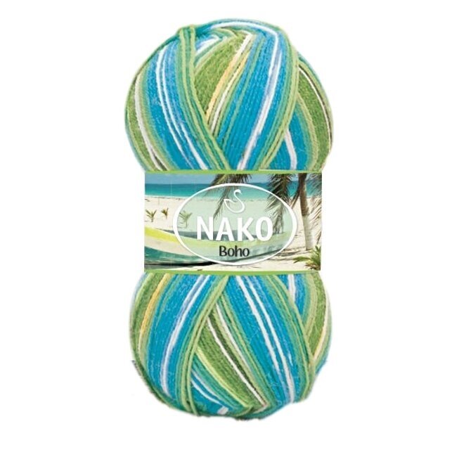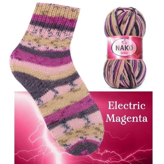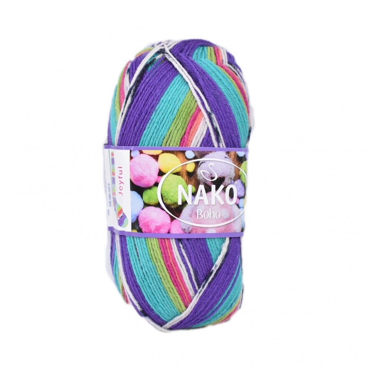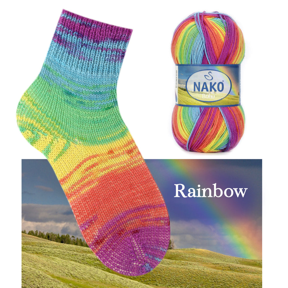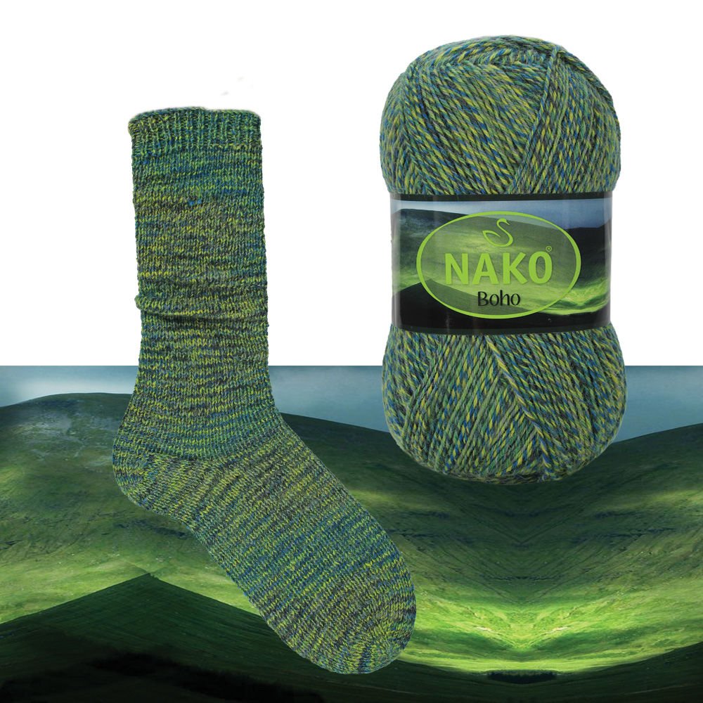 NAKO Boho brings a burst of energy to your knitting needles. Inspired by the free-spirited Bohemian style, this sock yarn features lively, self-patterning colorways that create fun stripes and motifs automatically as you work. It combines the classic warmth of wool with the strength of polyamide, making it the perfect choice for socks that are as durable as they are colorful.