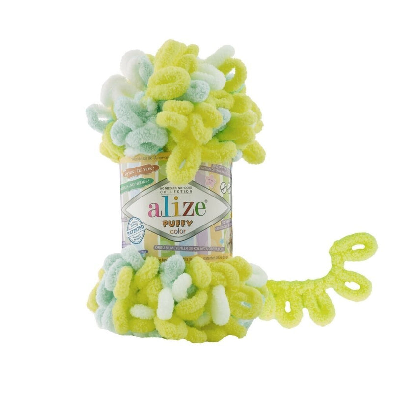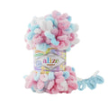 Alize Puffy Color brings a splash of joy and creativity to the world of finger knitting. This innovative yarn features the same beloved pre-formed loops as the classic Puffy, but with vibrant, self-patterning colorways. You don't need to change balls or weave in ends to create a stunning design—simply weave the loops with your fingers, and watch as colorful spots, stripes, and patterns emerge automatically.